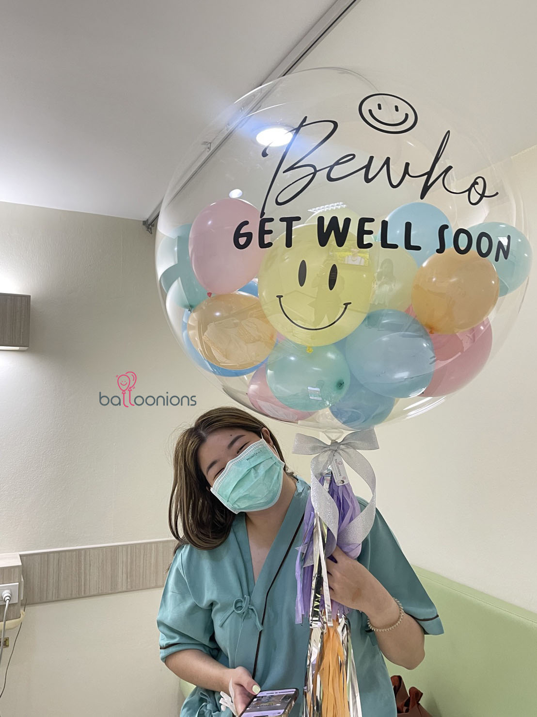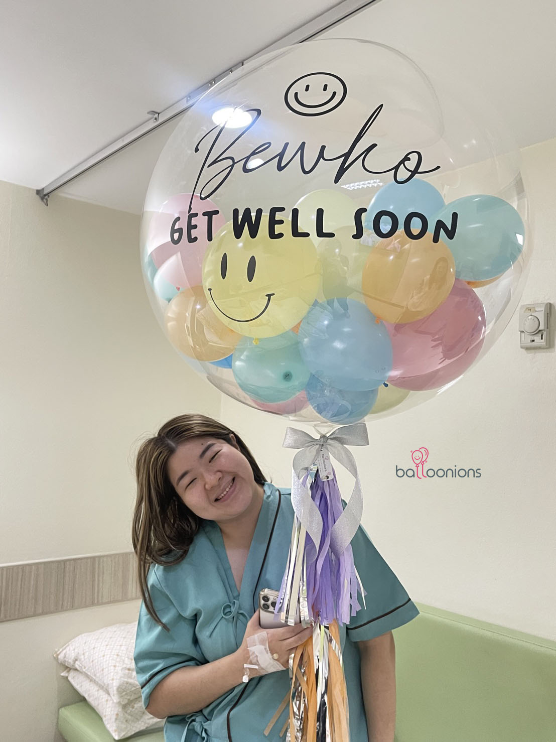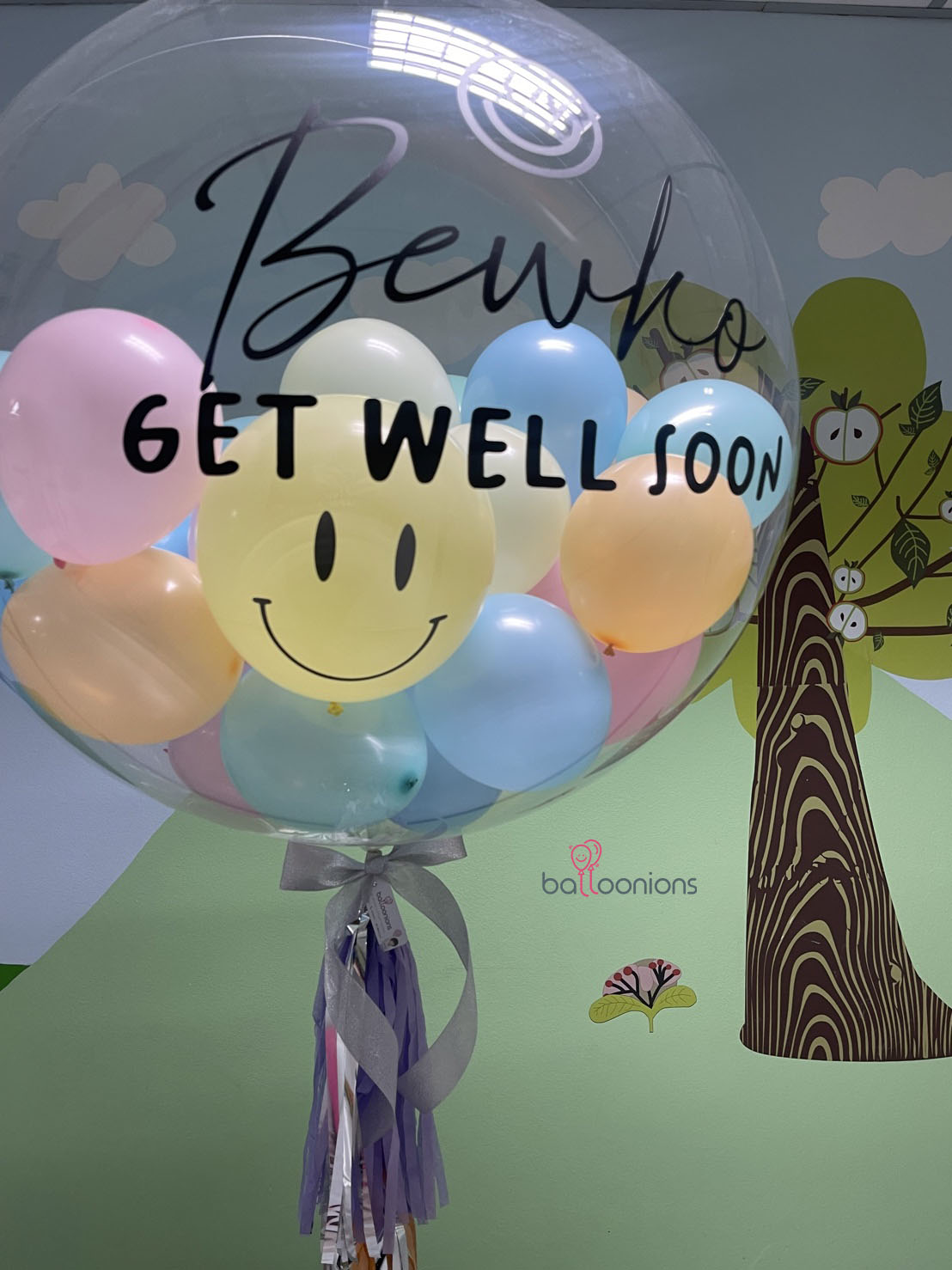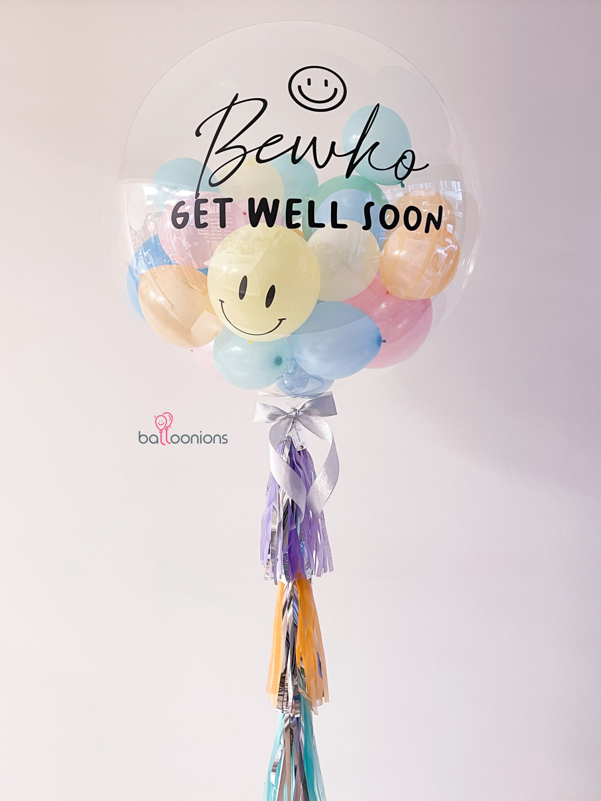 ลูกโป่ง Bubble 36″ พิมพ์ข้อความ “GET WELL SOON” พร้อมชื่อผู้รับและหน้ายิ้มสุดน่ารัก