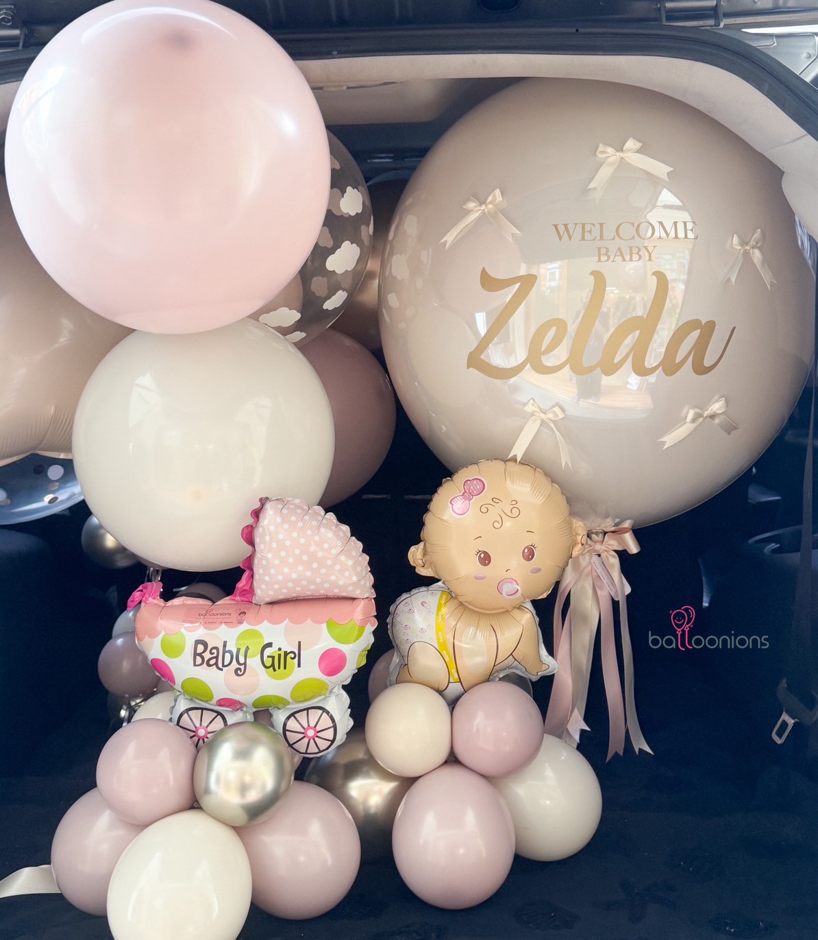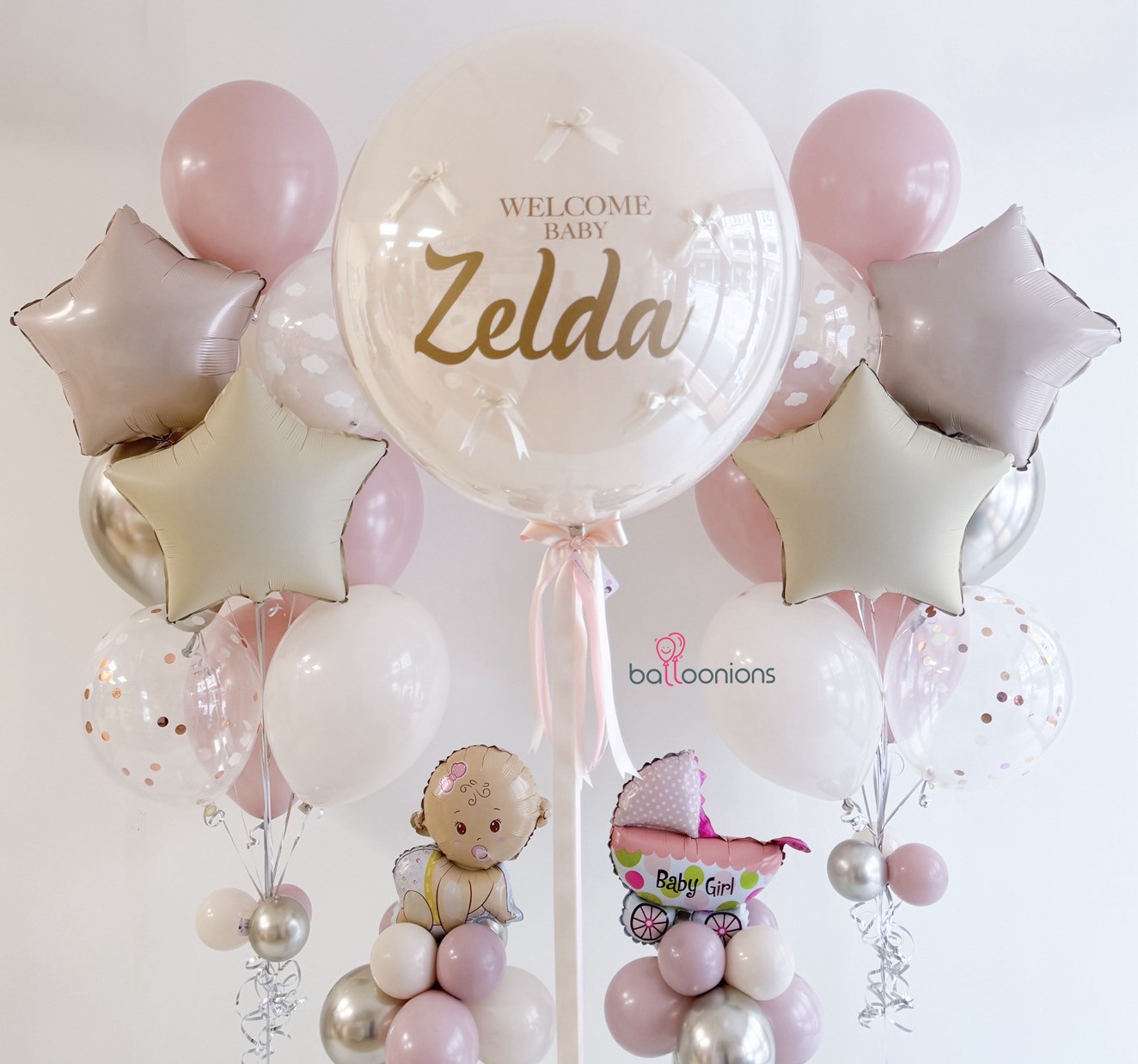 ลูกโป่ง Bubble พิมพ์ชื่อ + ช่อฟอยล์รูปเบบี๋และรถเข็นน่ารัก