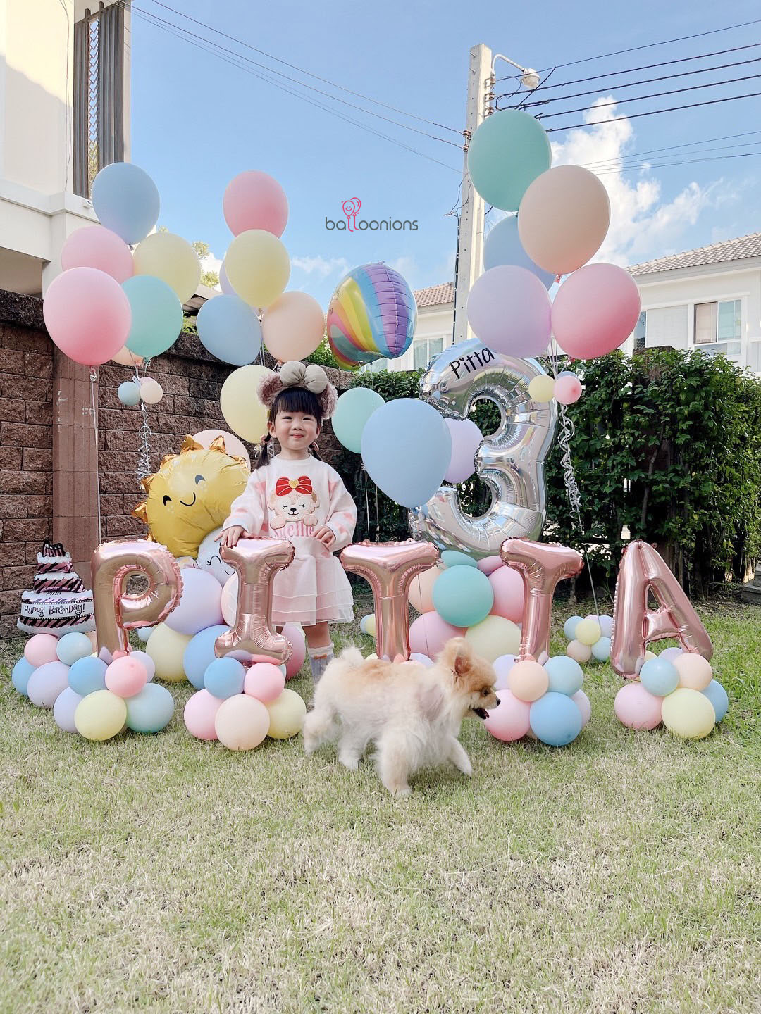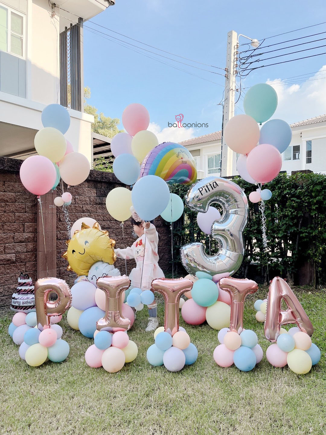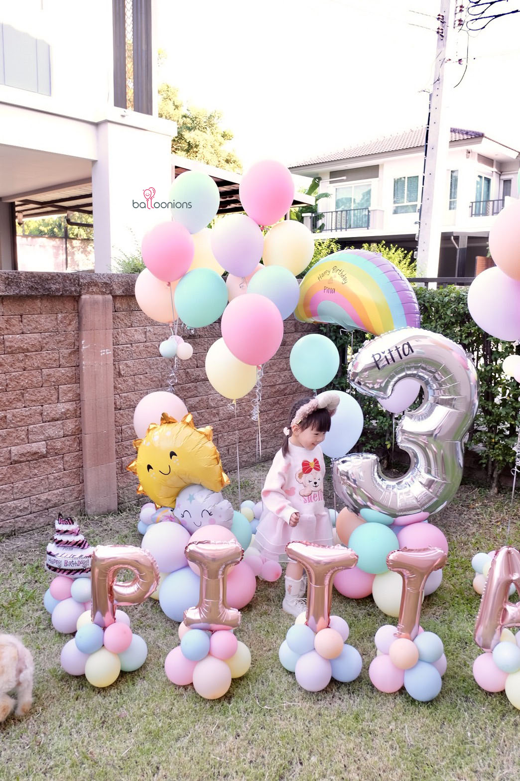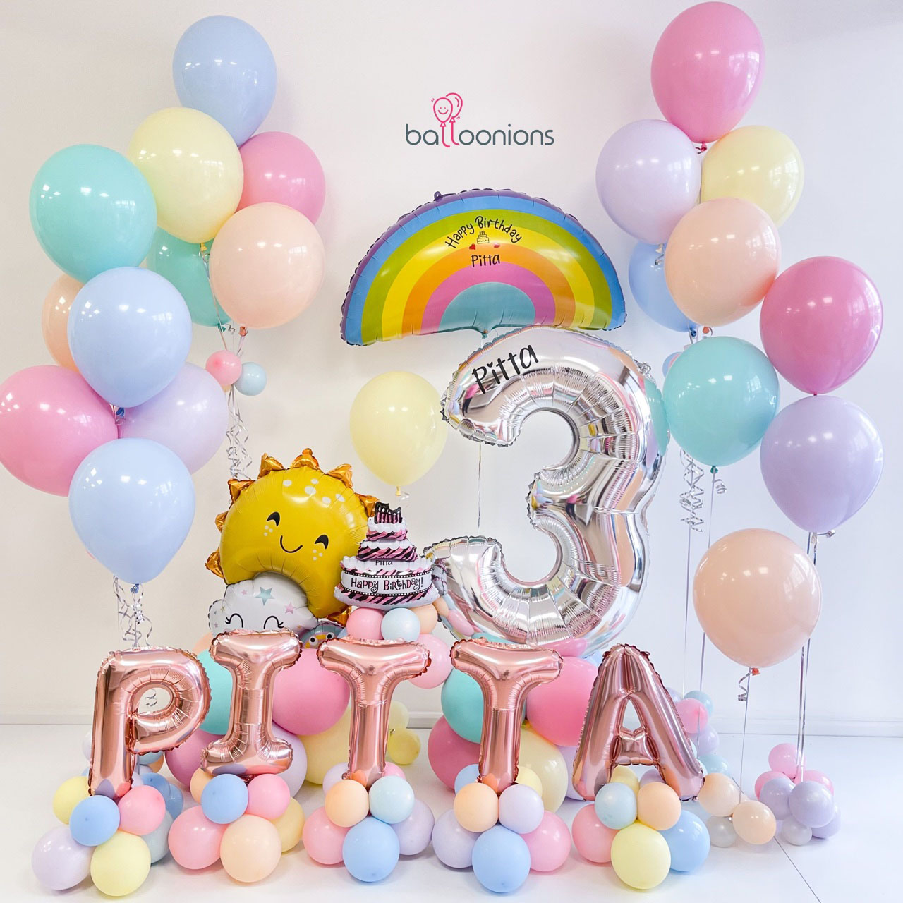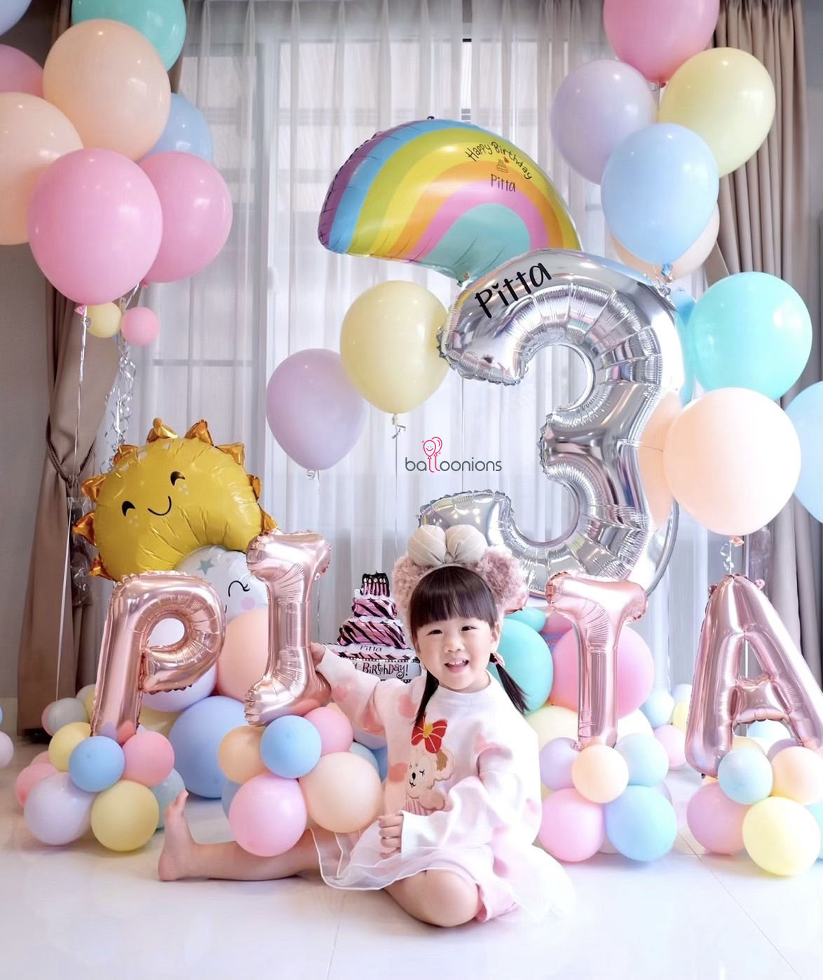 เซตวันเกิดเด็กน้อยสุดคิ้วท์ในธีมพาสเทลสายรุ้ง พร้อมลูกโป่งตัวเลขพิมพ์ชื่อ, ฟอยล์รุ้ง, ดวงอาทิตย์ และเค้กน่ารัก ตกแต่งให้มุมถ่ายรูปดูสดใสแบบ Instagrammable ทั้งเด็กและผู้ปกครองต้องยิ้ม! เหมาะสำหรับเด็กวัย 1–6 ขวบ ที่ชอบความละมุน สดใสไม่ซ้ำใคร